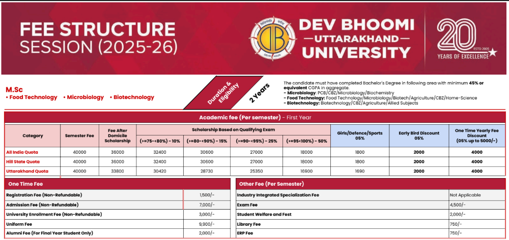 DBUU, DBIT M.Sc Microbiology is offered as 2 Years Full Time program. The minimum eligibility criteria for M.Sc is Graduation with 45%. The total fees for DBUU, DBIT M.Sc Microbiology in 2025 is ₹ 2.15 Lakhs for the complete course duration, which includes total tuition fees of ₹ 1.6 Lakhs. Earlier, the fees in 2024 - 2025 for M.Sc Microbiology was ₹ 1.2 Lakhs.