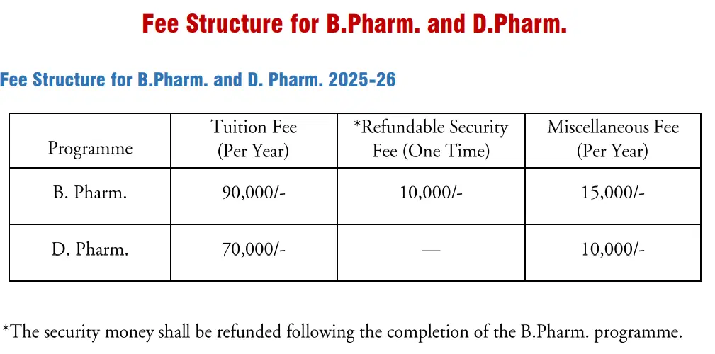 GS UNIVERSITY D.Pharm Pharmacy fees in first year is ₹ 80,000. The detailed fees is mentioned below.GS UNIVERSITY Hostel Fee is ₹ 1 Lakh to 3.47 Lakhs.