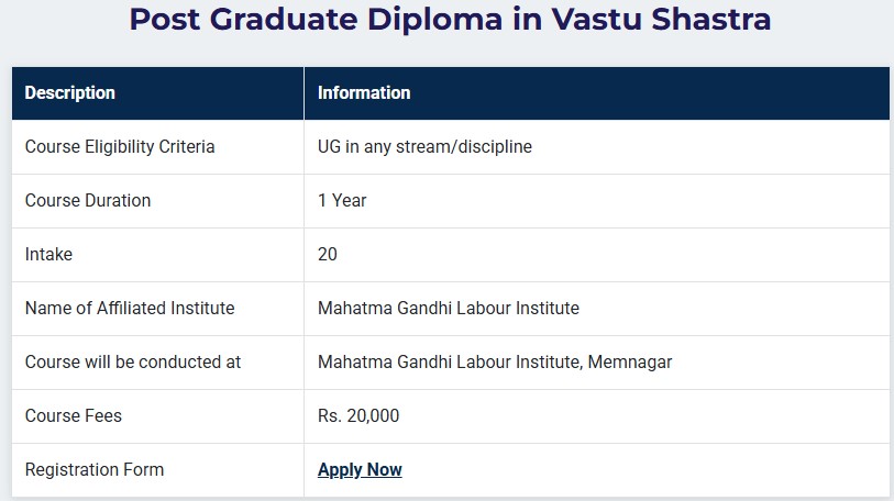 Kaushalya The Skill University Ahmedabad offers a total of 20 seats for PG Diploma Vastu Shastra. Candidates must have at least Graduation to be eligible for admissions.