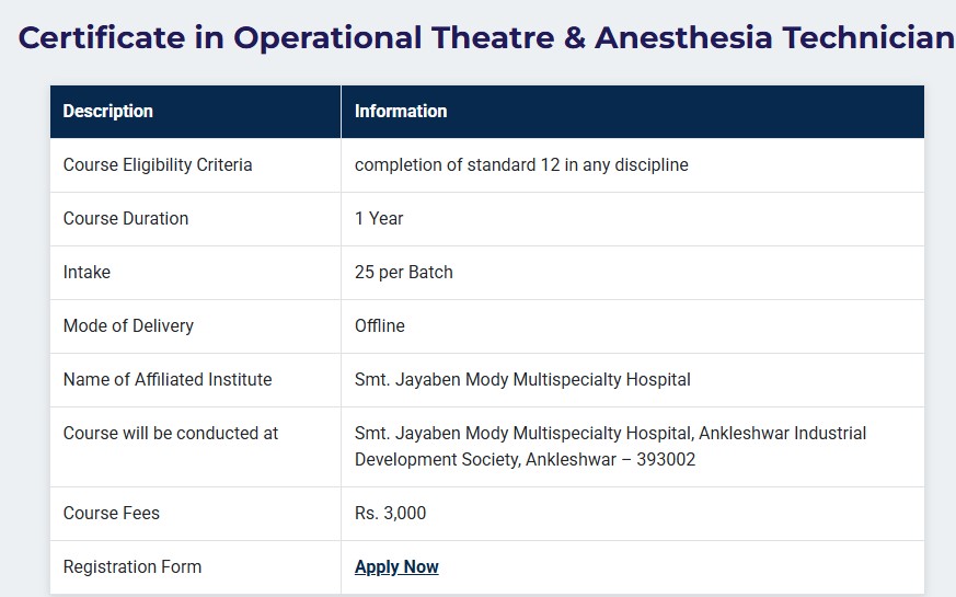 Kaushalya The Skill University Ahmedabad offers a total of 25 seats for Certification Anesthesia Technician. Candidates must have at least 10+2 to be eligible for admissions.