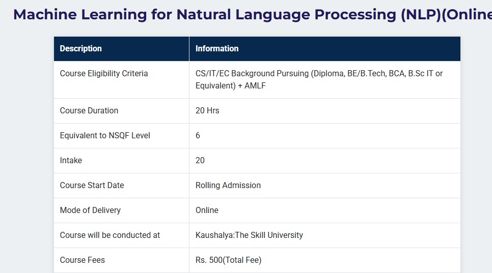 Certification Machine Learning at Kaushalya The Skill University Ahmedabad is a 1 Month Certification. The course is offered Online as a Part Time program. Kaushalya The Skill University Ahmedabad Certification Machine Learning Total Fees is INR 500 for 2025.