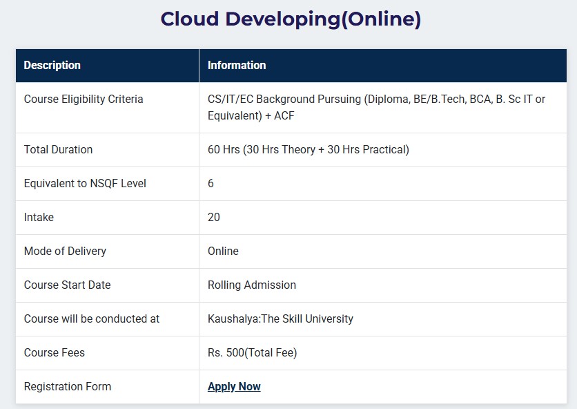 Kaushalya The Skill University Ahmedabad offers a total of 20 seats for Certification Cloud Develops. Candidates must have at least Diploma to be eligible for admissions.