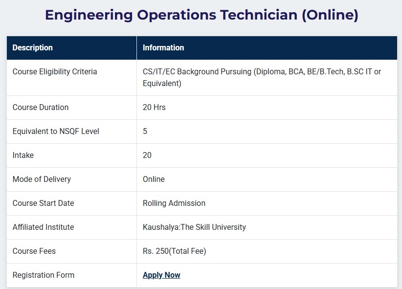 Certification Engineering Operations Technician at Kaushalya The Skill University Ahmedabad is a 1 Month Certification. The course is offered Online as a Part Time program. Kaushalya The Skill University Ahmedabad Certification Engineering Operations Technician Total Fees is INR 250 for 2025.