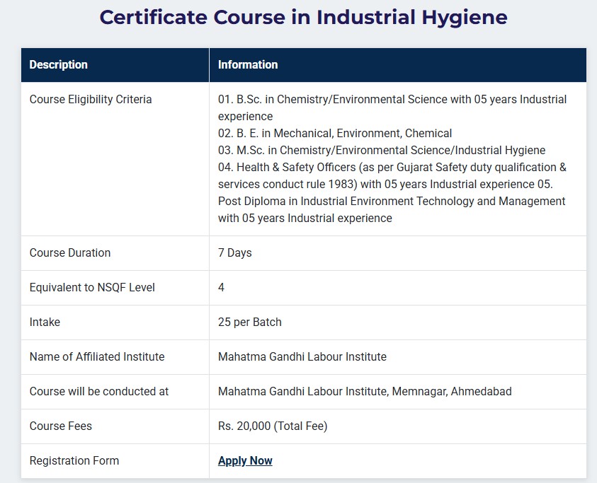 Kaushalya The Skill University Ahmedabad offers a total of 25 seats for Certification Industrial Hygiene. Candidates must have at least Graduation to be eligible for admissions.