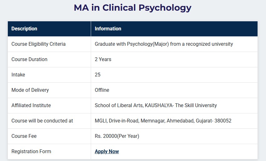 Kaushalya The Skill University Ahmedabad offers a total of 25 seats for MA Clinical Psychology. Candidates must have at least Graduation to be eligible for admissions.