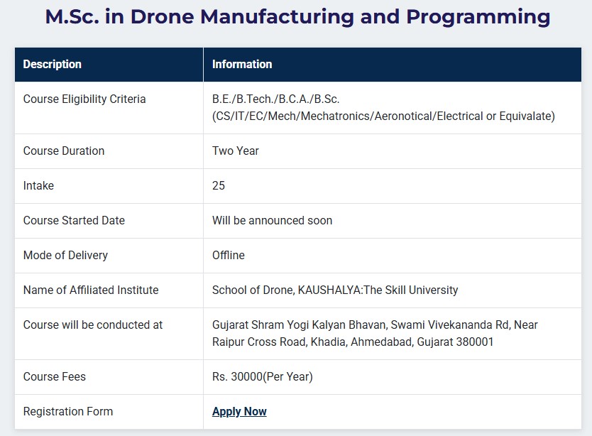 Kaushalya The Skill University Ahmedabad offers a total of 25 seats for M.Sc Drone Manufacturing & Programming. Candidates must have at least Graduation to be eligible for admissions.