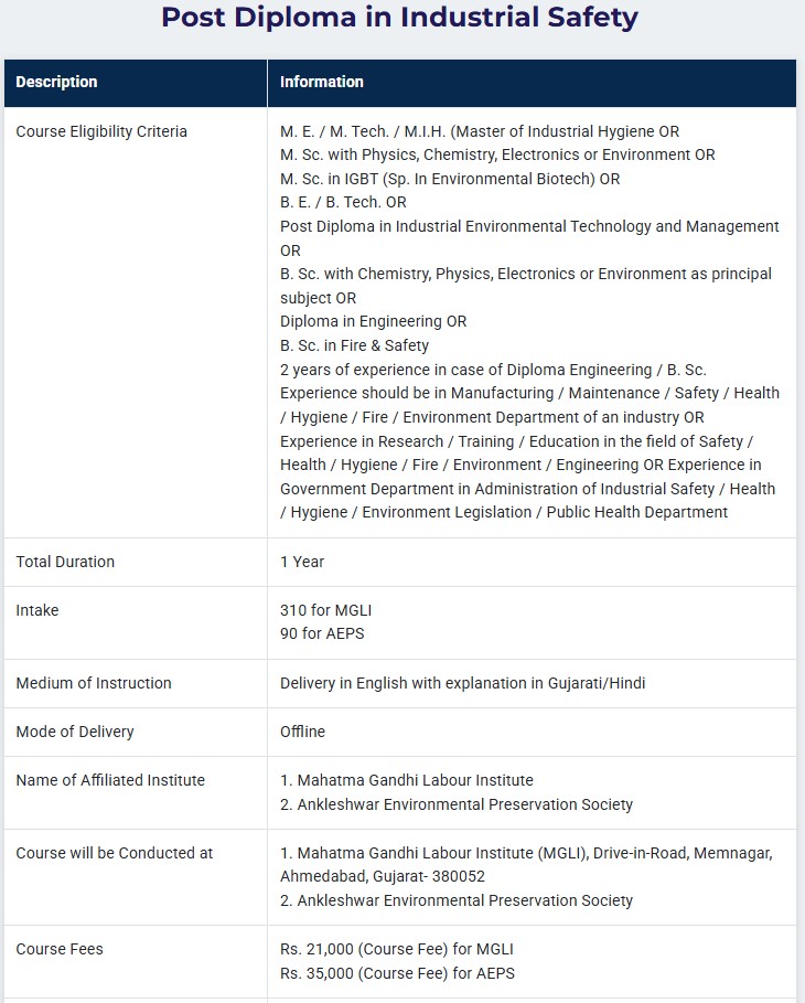 Kaushalya The Skill University Ahmedabad offers a total of 310 seats for PG Diploma Industrial safety. Candidates must have at least Graduation to be eligible for admissions.