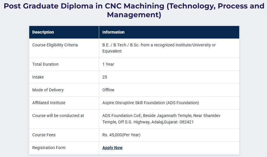 Kaushalya The Skill University Ahmedabad offers a total of 25 seats for PG Diploma CNC Machining. Candidates must have at least Graduation to be eligible for admissions.