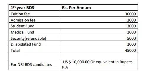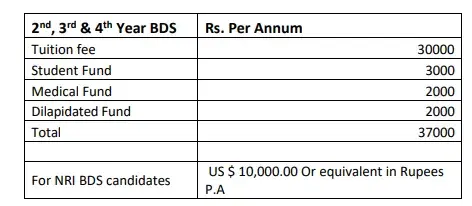 45,000, and for the subsequent three years, it is Rs. 37,000 per annum. NRI candidates in the BDS course at government colleges need to pay USD 10,000. In contrast, private college fees are higher, with the state quota set at Rs. 170,000 per year and the management quota at Rs.