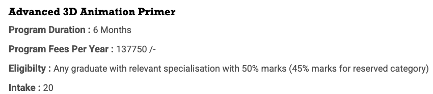 JSPM University, Pune Certification 3D Animation Prime is offered as 1 Year Full Time program, with total intake of 20 seats. The minimum eligibility criteria for Certification is Graduation with 50%. The total fees for JSPM University, Pune Certification 3D Animation Prime in 2025 is ₹ 1.38 Lakhs for the complete course duration.