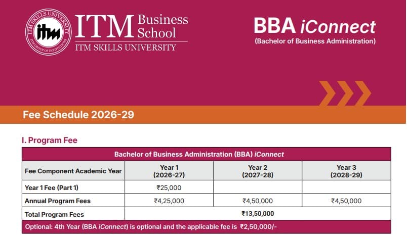 Earlier, BBA E-Commerce and Digital Marketing fees at ITM Skills University Navi Mumbai was ₹ 12.95 Lakhs (in 2025) for the entire course duration. This shows a fee increase of ₹ 55,000 over the year.