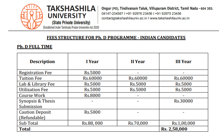 Takshashila University Villupuram Ph.D Commerce fees 2025 is ₹ 2.58 Lakhs for the entire course duration.