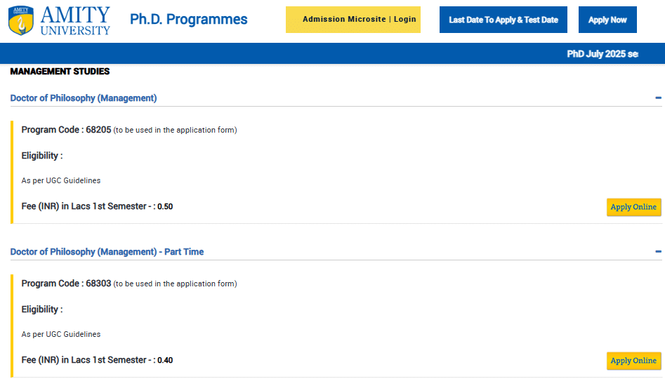 Students have an option to pursue Ph.D Management from similar colleges such as Amity University Gurgaon, Amity University Jaipur, Amity University Bangalore, Amity University Gwalior. Similar to Amity University Bangalore, Ph.D Management at these group colleges is offered Part Time for a duration of 3 Years.