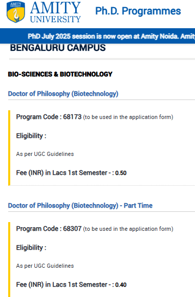 Students have an option to pursue Ph.D Biotechnology from similar colleges such as Amity University Noida, Amity University Gurgaon, Amity University Jaipur, Amity University Bangalore. Similar to Amity University Bangalore, Ph.D Biotechnology at these group colleges is offered Part Time for a duration of 3 Years.