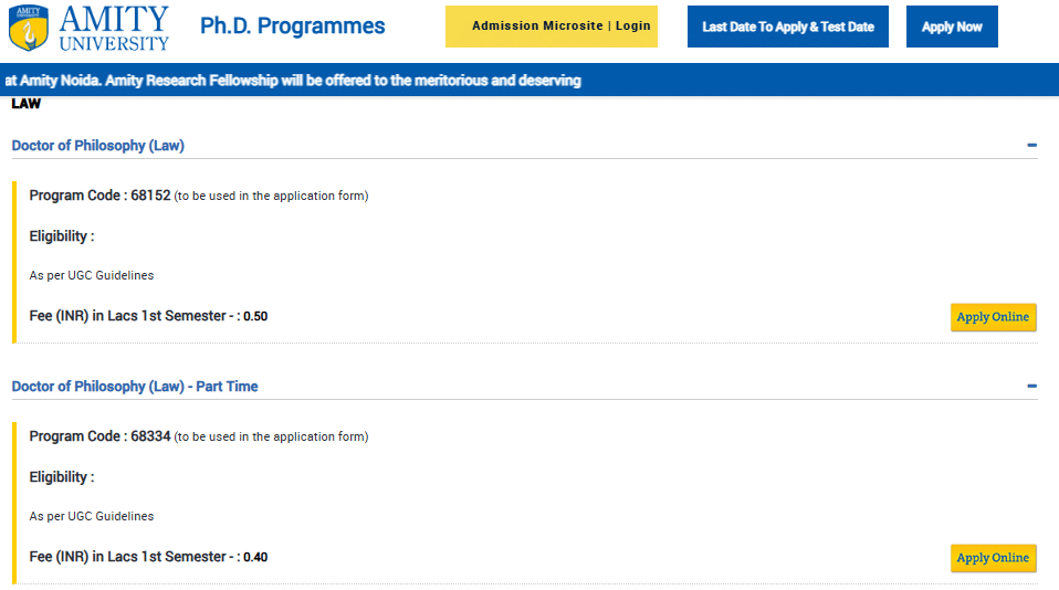 Students have an option to pursue Ph.D Law from similar colleges such as Amity University Noida, Amity University Bangalore, Amity University Jaipur, Amity University Gurgaon. Similar to Amity University Bangalore, Ph.D Law at these group colleges is offered Full Time for a duration of 3 Years.