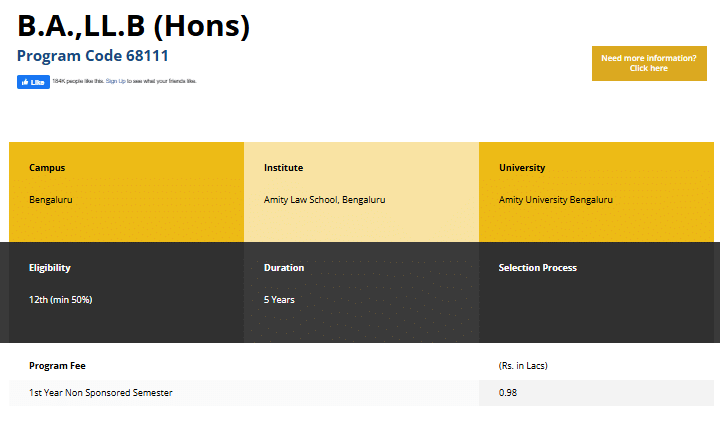 Students have an option to pursue L.L.B {Hons.} from similar colleges such as Amity University Bangalore, Amity University Noida, Amity University Patna, Amity University Gwalior. Similar to Amity University Bangalore, L.L.B {Hons.} at these group colleges is offered Full Time for a duration of 5 Years.
