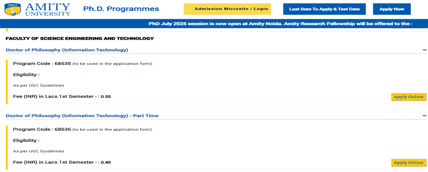 Comparing the course fees at these colleges, the total course fee at Amity University Noida is the highest with ₹ 3.2 Lakhs. This is followed by Amity University Bangalore with ₹ 3 Lakhs and Amity University Gurgaon with ₹ 2.9 Lakhs. Among these, Amity University Jaipur has the lowest fee for Ph.D Information Technology with ₹ 2.9 Lakhs.