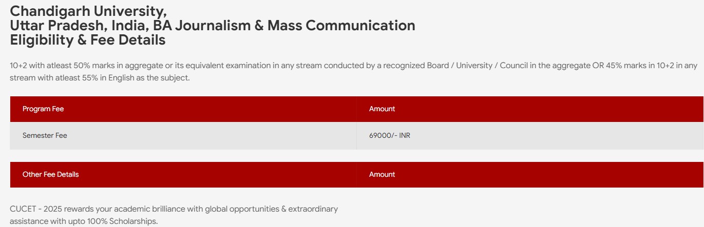 Chandigarh University Lucknow BAJMC {Hons.} Journalism and Mass Communication fees 2026 is ₹ 5.52 Lakhs for the entire course duration.