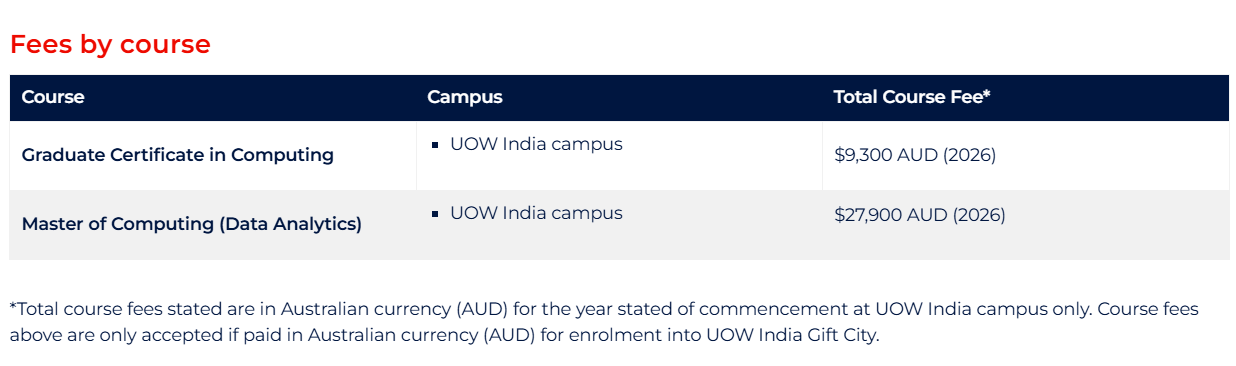 Certification Computing Fees at University of Wollongong India Gandhinagar covers a range of expenses, including tuition fee, course materials, and access to campus facilities.