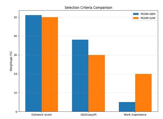 | PGDM-ABM | Graduation with minimum 50% marks + valid CAT score | Selection based on CAT score (51%), Diversity Factor (6%), Group Discussion (12%), Essay Writing (10%), Personal Interview (16%), Work Experience (5%) |