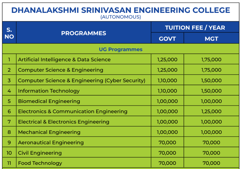 B.Tech Computer Science and Engineering Fees at Dhanalakshmi Srinivasan University covers a range of expenses, including tuition fee, course materials, and access to campus facilities.