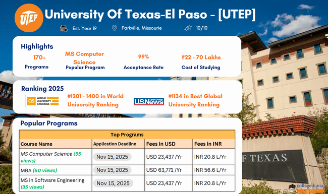 Students planning to apply to the graduate programs need an undergraduate degree with a minimum GPA of 3.0 on a 4.0 scale (85%) for admission to UTEP. Students applying to the undergraduate programs in UTEP need a high school certificate with a minimum GPA of 2.0 on a 4.0 scale (75%). The undergraduate tuition fee in The University of Texas at El Paso is 21,164 USD (17.36 lakhs INR) for international students. The graduate tuition fee is 17,530 USD (14.38 lakhs INR). The university exhibits a high return on investment. UTEP graduates reportedly earn an average salary of 72,000 USD per year (59.07 lakhs INR).