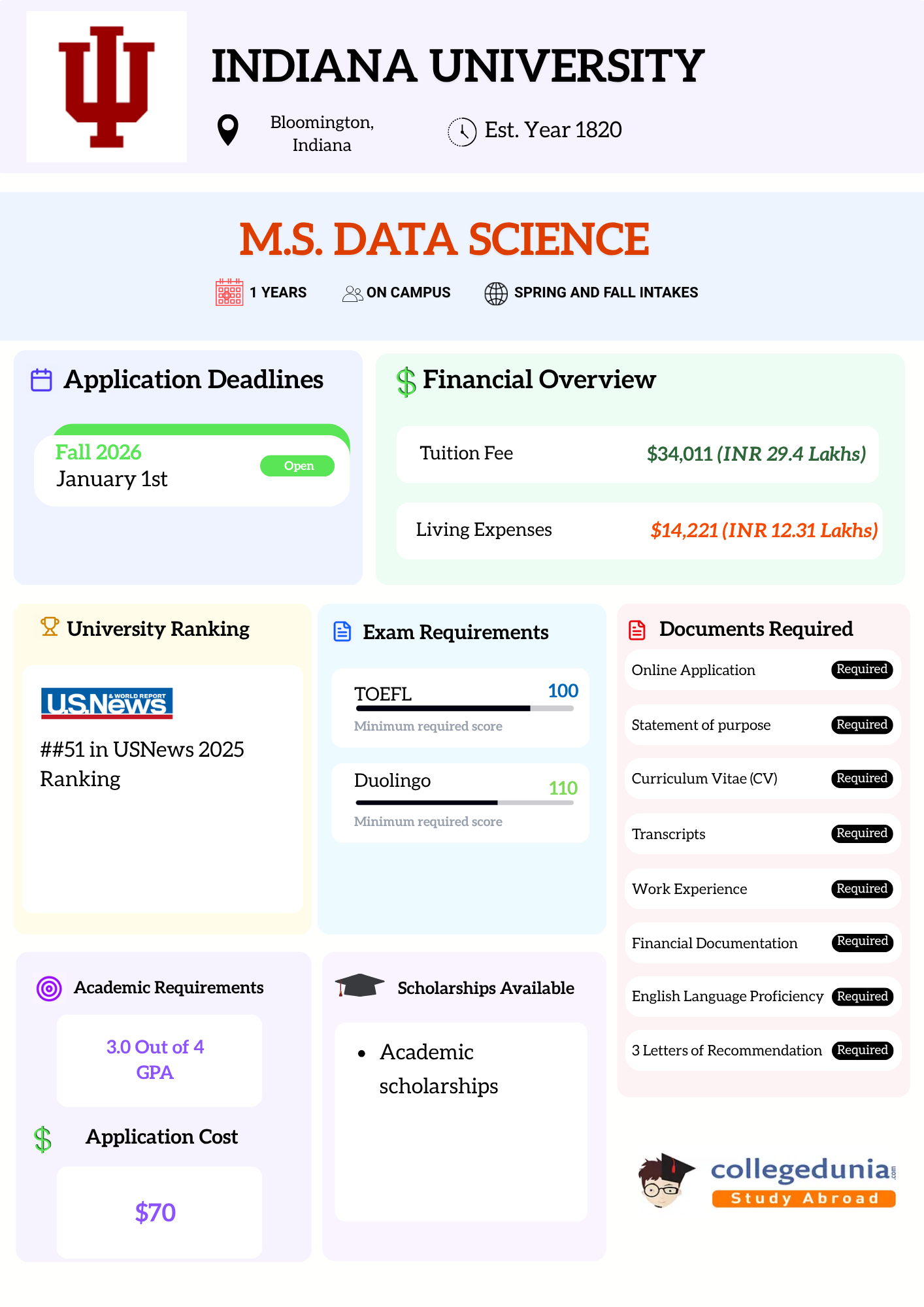 The M.S. in Data Science from Indiana University is a 1-year, full-time postgraduate program offered by the Luddy School of Informatics, Computing, and Engineering. The program has a single intake. A non-refundable enrollment deposit is required upon acceptance of the application. International students may be considered for scholarships, which offer a tuition fee discount depending on merit.
