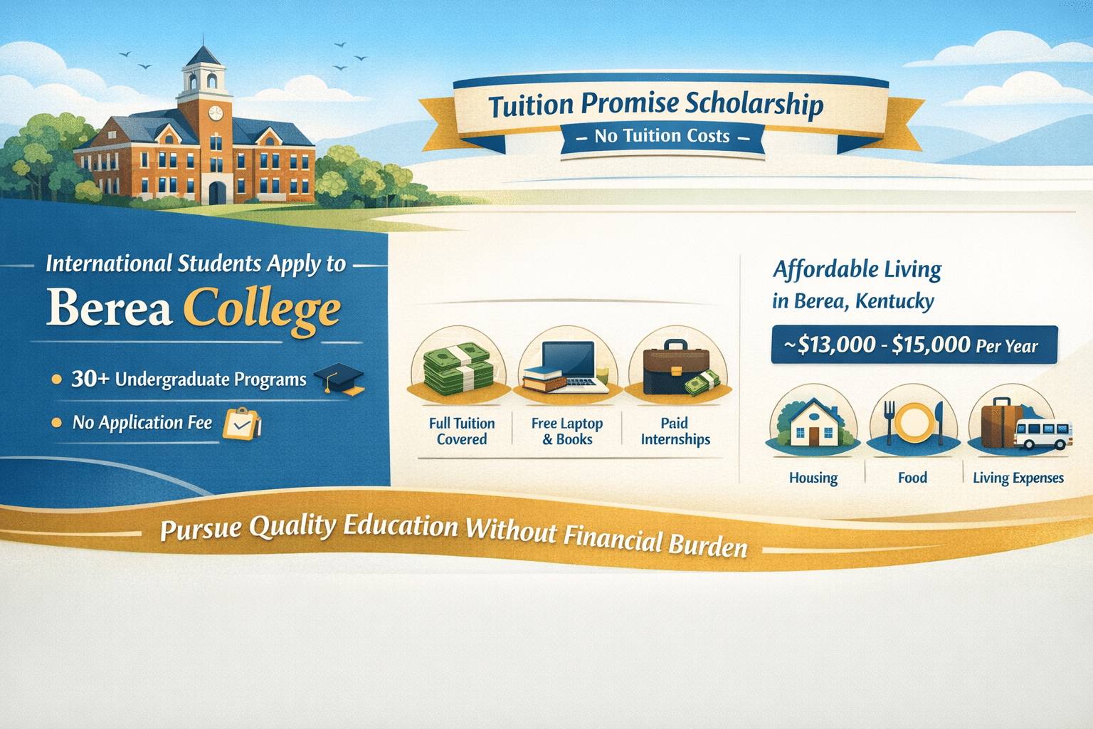 Berea College offers the Tuition Promise Scholarship to all (US National + International students). It covers the whole cost of tuition fees at Berea College for all admitted students. Students are admitted to the college based not only on their grades but also on their financial conditions.