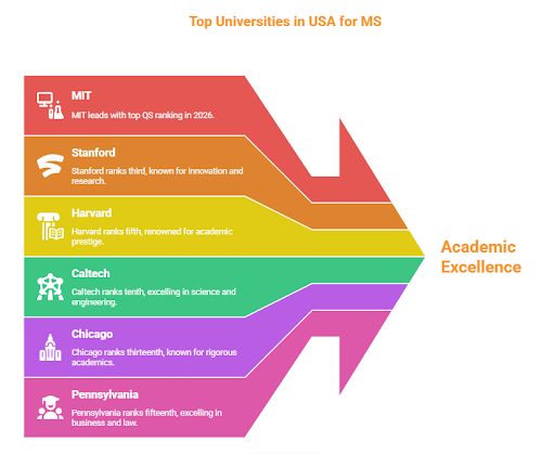 MIT ranks #1 in QS 2026, offering elite MS programs in Computer Science, Analytics, and Engineering. Stanford is ranked #3 QS, #6 THE and specializes in AI, Finance, and Computational Sciences. Harvard (#5 QS, #3 THE) is best known for Public Health, Data Science, and Computational Engineering. Other top-ranked schools include Caltech (#10 QS), Chicago (#13 QS), and Penn (#15 QS) making them the best universities in the U.S. for master’s,