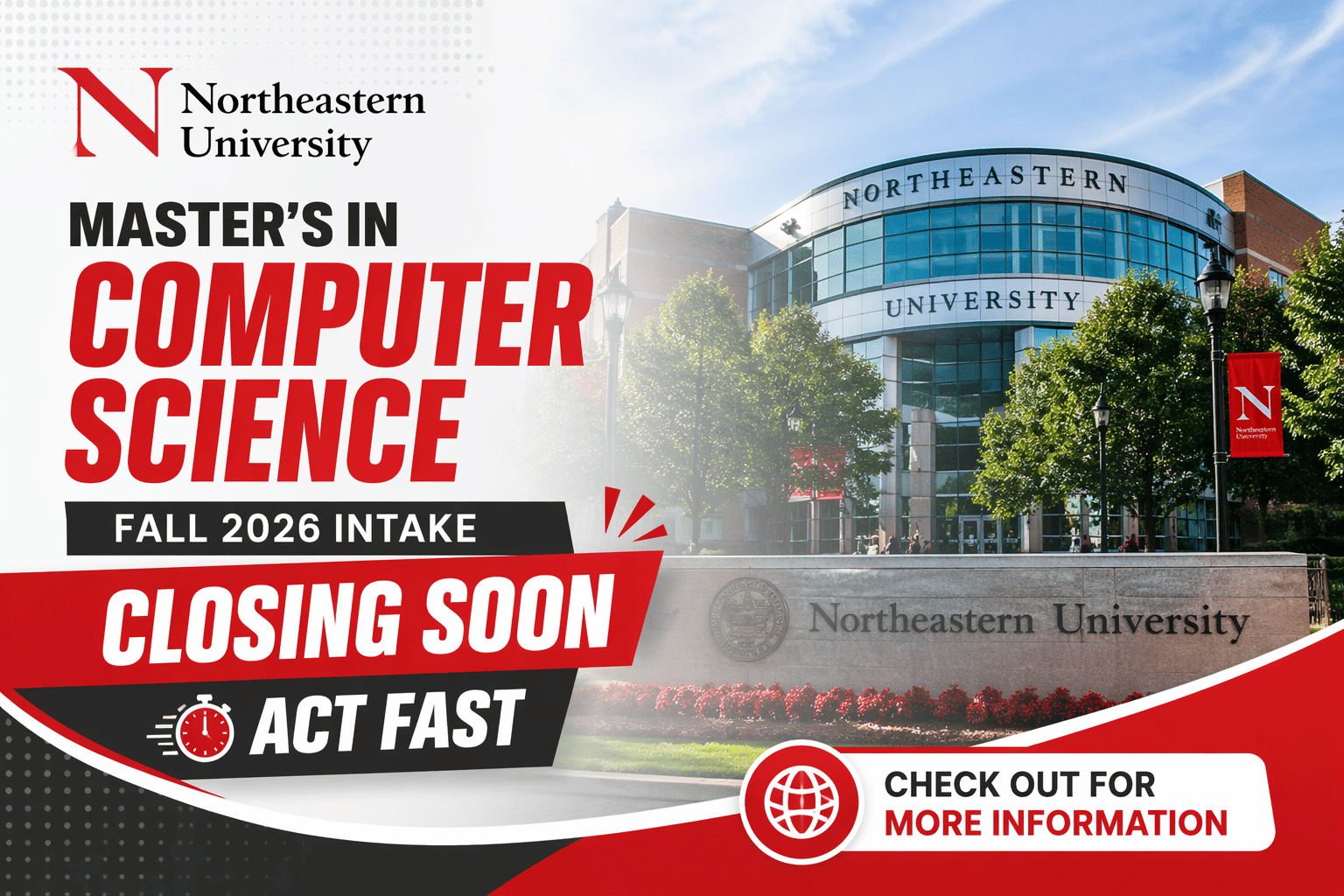 Northeastern University’s Master of Science in Computer Science (MSCS) Fall 2026 intake is closing soon, with the final application deadline set for May 1, 2026 for international students. This highly competitive program is consistently ranked among the top computer science master’s degrees in the United States and is known for its strong industry integration and flexible campus options, including Boston, Silicon Valley, Seattle, Toronto, and Vancouver.