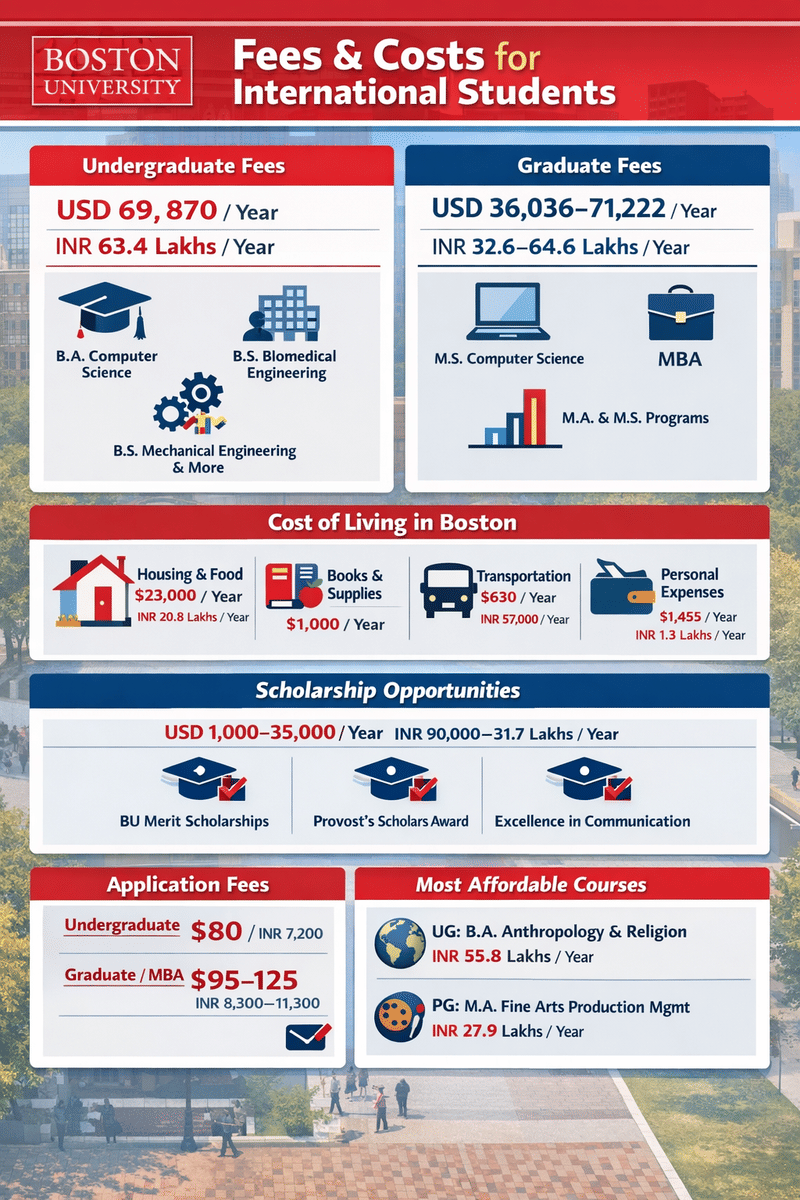 The yearly living expenses for students living in Boston are USD 23,000 / INR 20.8 Lakhs. To manage these expenses, the university offers various scholarships to international students like BU Merit Scholarship for Juniors, Merit Based Scholarships, and others, which offers the amount in the range of USD 1,000-35,000 / INR 90,000-31.7 Lakhs.