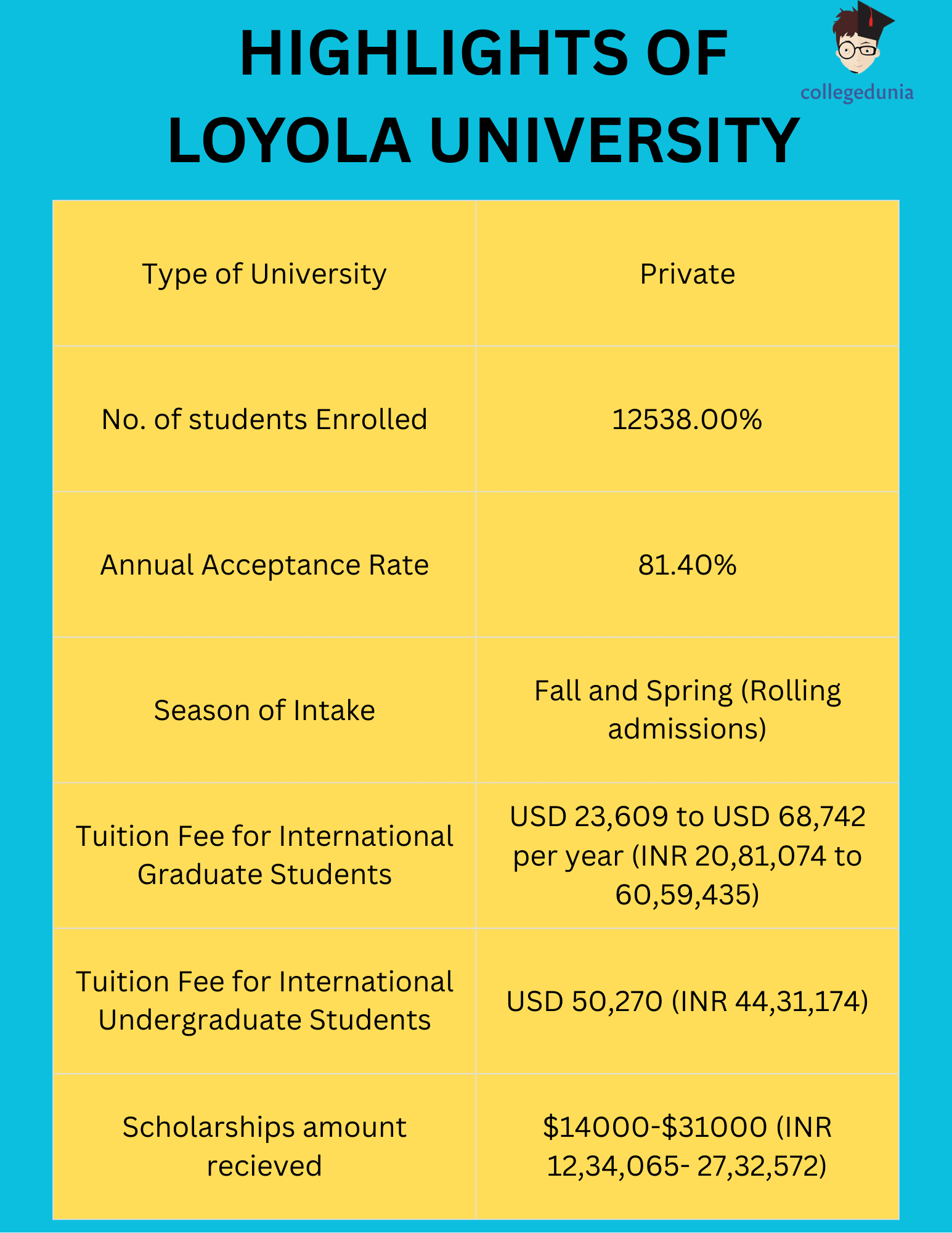 Ans: Loyola University does not charge any application fee. However, an enrollment deposit of USD 500 (INR 44,073)has to be paid by the students. This is to secure your spot and is refundable until May 1, 2026
