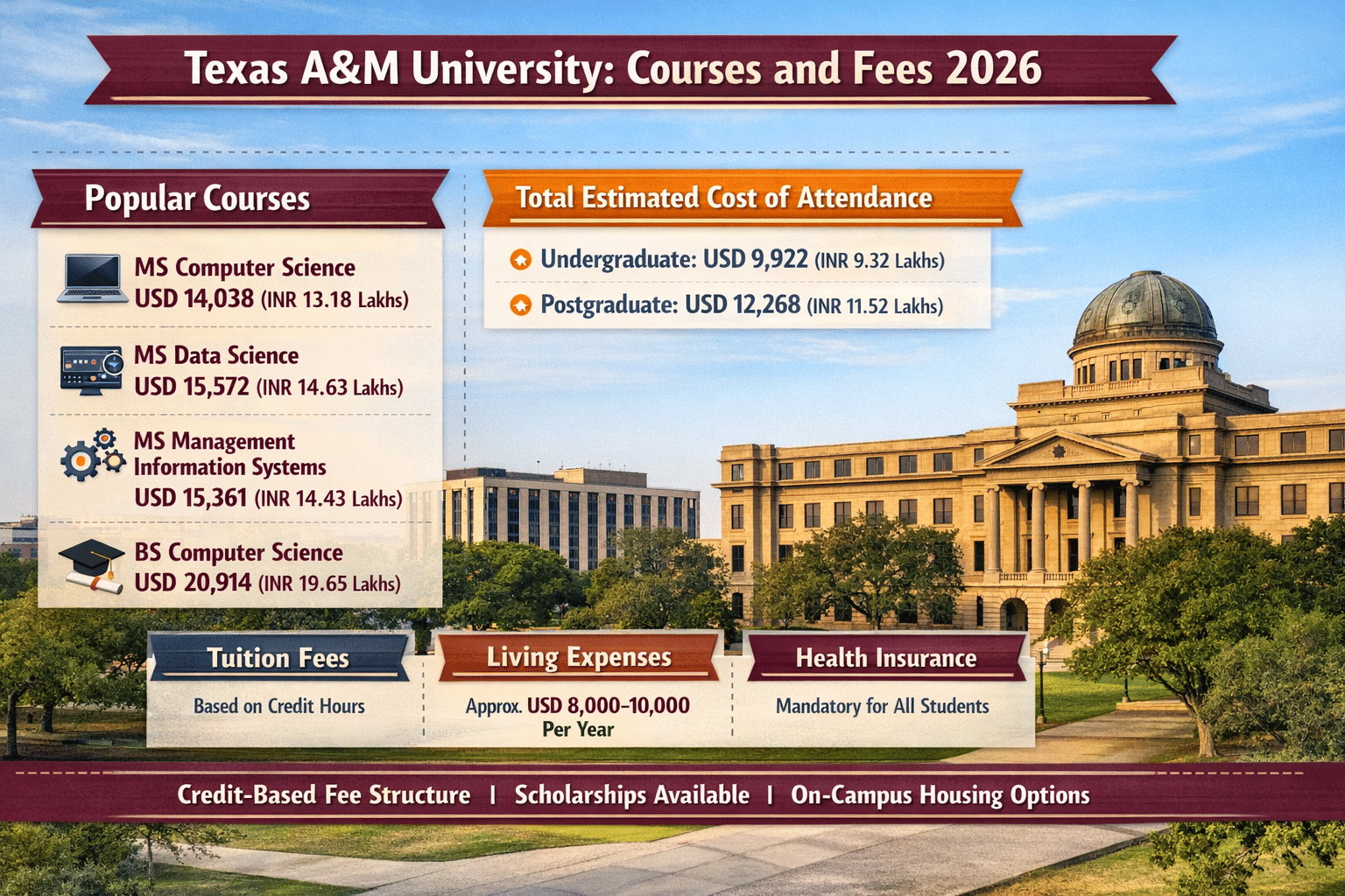 Texas A&M University offers a wide range of courses with a flexible, credit-based fee system, making it suitable for Indian students with different academic goals and budgets. While the tuition fees and living costs can be high, the university provides good value through quality education, strong faculty, and excellent career opportunities.
