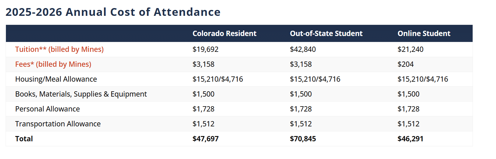 The tuition fee for MS Computer Science at Colorado Mines is USD 42840 per year (₹ 38.82 Lakhs). Meanwhile, the total cost is USD 70664/Year (₹ 64.04 Lakhs). This includes the tuition fee and other expenses such as Living Cost, Books & Supplies, Health Insurance, etc.