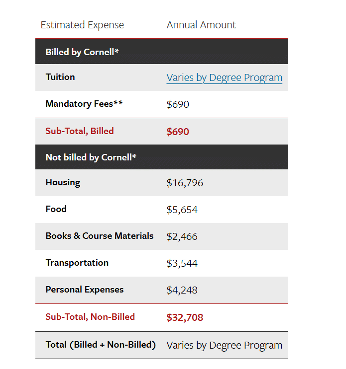 The tuition fee for M.S Plant Breeding at Cornell U is USD 68380 per year (₹ 60.69 Lakhs). Meanwhile, the total cost is USD 100293/Year (₹ 89.02 Lakhs). This includes the tuition fee and other expenses such as Living Cost, Books & Supplies, Health Insurance, etc.