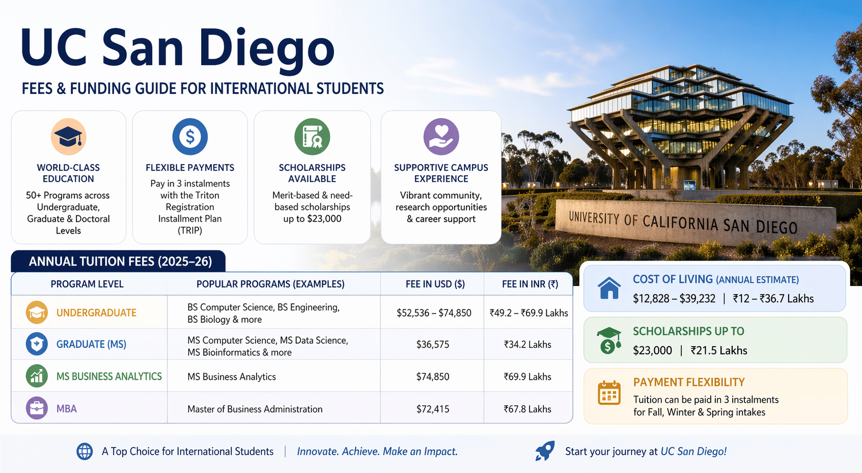 The table below mentions the annual tuition fees for international students at the University of California San Diego. Annual tuition fees can be paid in one go or in 3 instalments.