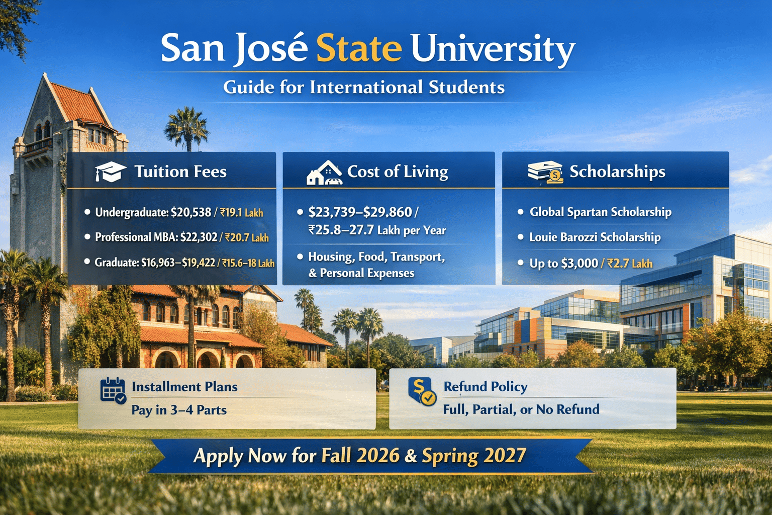 International students living in San Jose can expect an annual expense in the range of $23,739-29,860 / ₹25.8-27.7 Lakhs. San Jose State University offers scholarships like the Global Spartan Scholarship and the Louie Barozzi Scholarship, with awards ranging from $2,000-3,000 / ₹1.8-2.7 Lakhs.