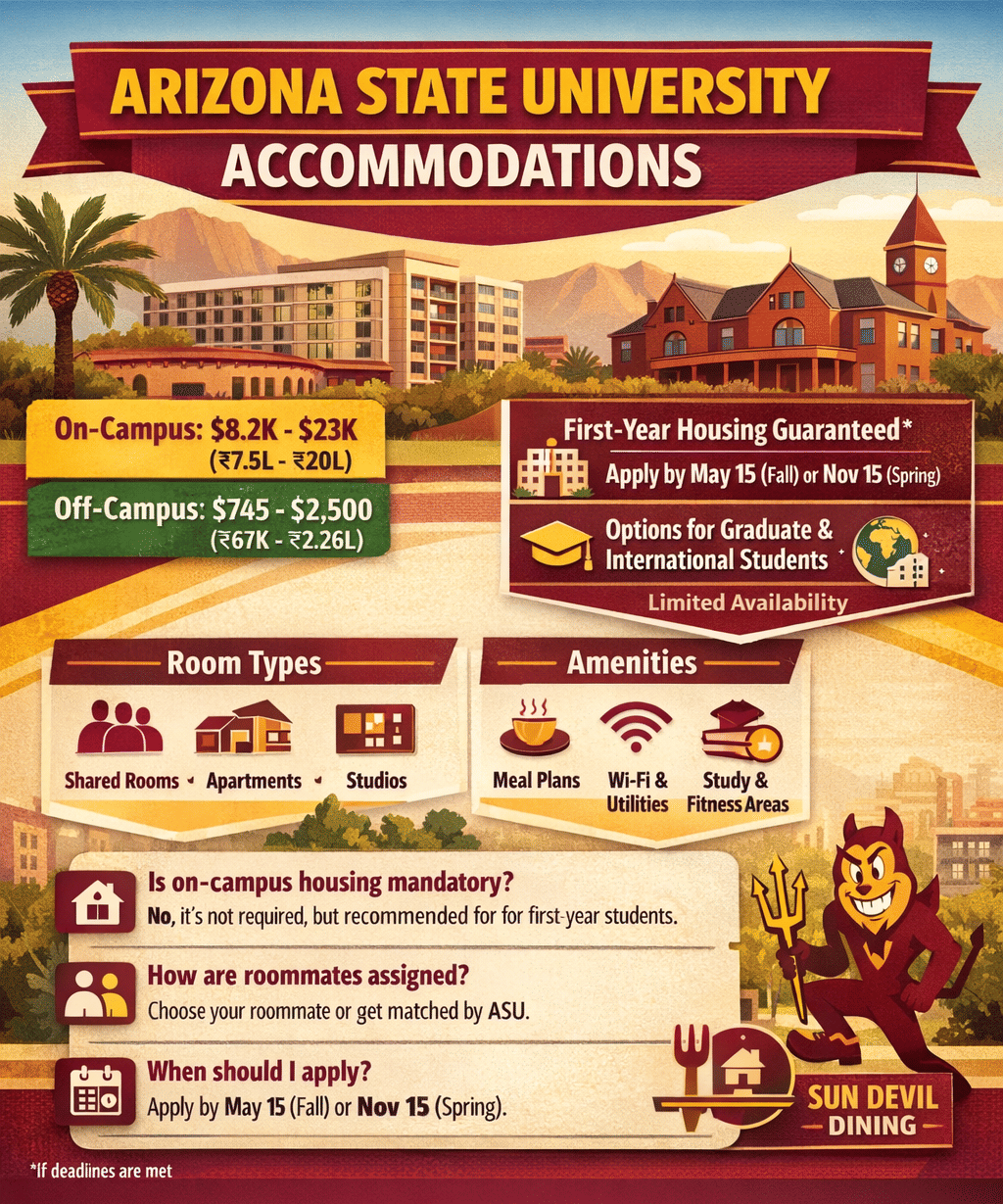 ASU accommodations include furnished rooms, utilities, community facilities, and access to *Sun Devil Dining meal plans. Off-campus alternatives near the Tempe campus range from roughly $745 to $2,500 (67,485 to 2.26 lakhs INR) per month, depending on location and privacy level.