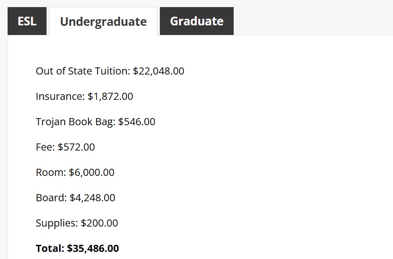 The tuition fee for Bachelor Risk Management and Insurance - Global Business at troy univ is USD 22048 per year (₹ 20.09 Lakhs). Meanwhile, the total cost is USD 35486/Year (₹ 32.33 Lakhs). This includes the tuition fee and other expenses such as Living Cost, Books & Supplies, Health Insurance, etc.