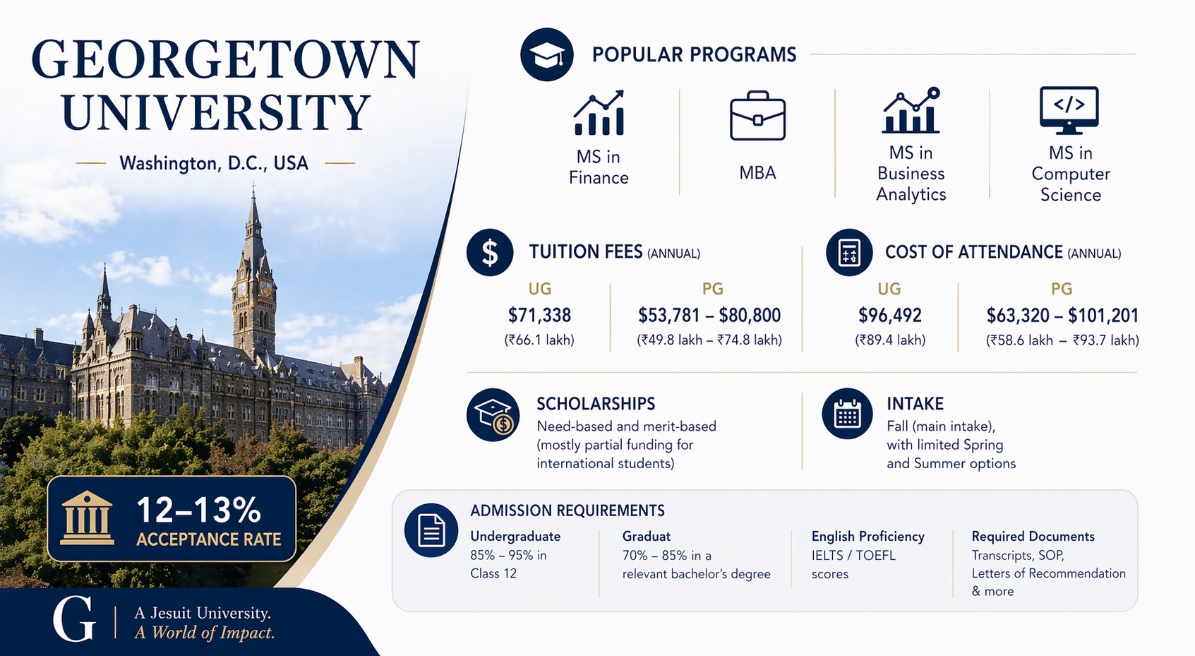 Georgetown University is a competitive university with a 12–13% acceptance rate. The total cost can reach ₹89 lakh for undergraduate students and ₹93 lakh for graduate students annually, and since most scholarships are partial, financial planning is crucial. For admissions, Indian students typically need around 85%–95% in Class 12 for undergraduate programs and 70%–85% in a relevant bachelor’s degree for postgraduate courses, along with English language test scores such as IELTS or TOEFL and supporting documents like SOP, LORs, and transcripts.