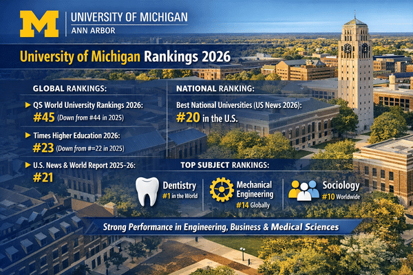 At the national level, the University of Michigan, Ann Arbor, continues to maintain a strong reputation in the United States. It ranked #20 in Best National Universities (US News 2026), indicating stable academic standing.