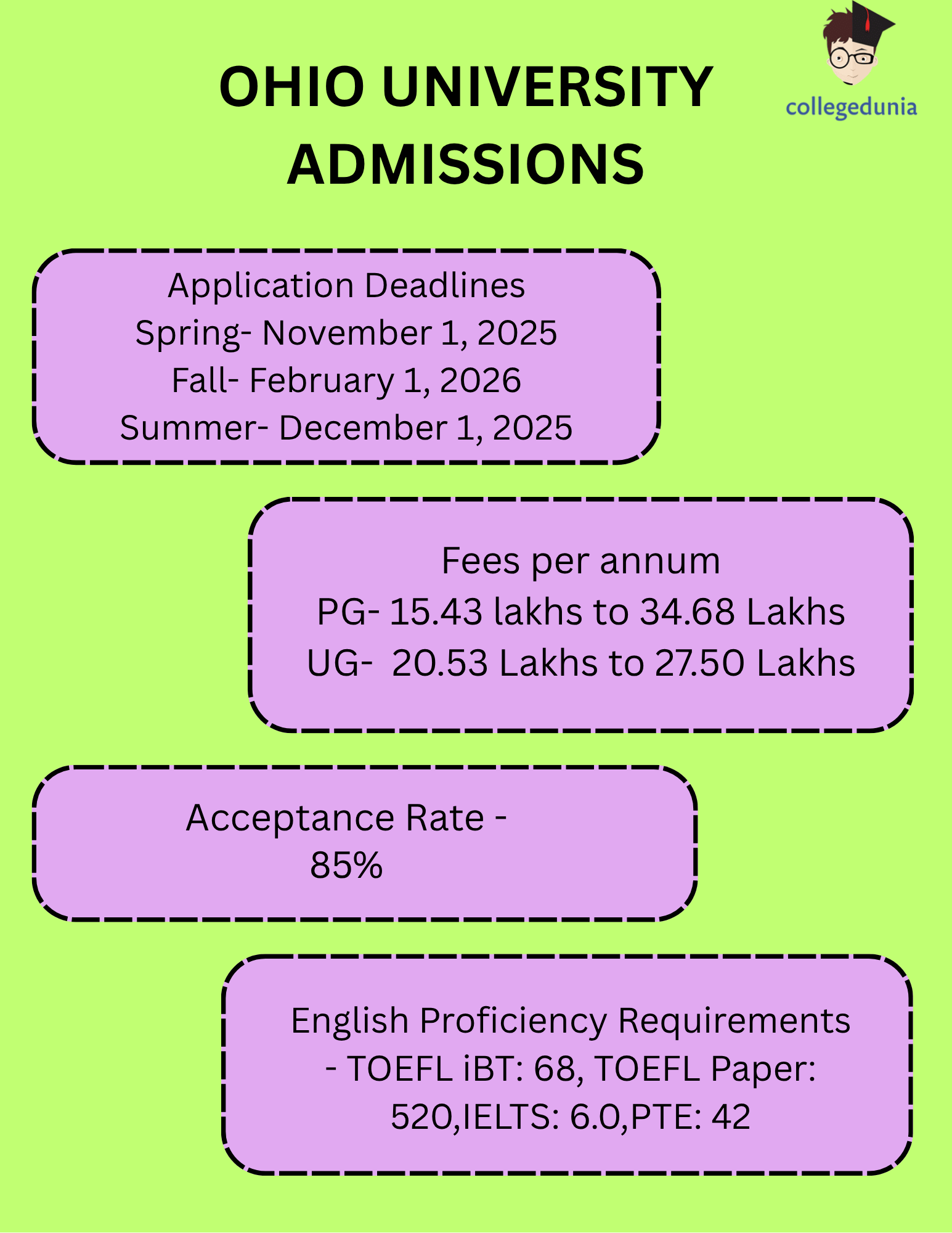 Ohio University offers admissions in 3 intakes for international students: Fall, Spring, and Summer Intake. The deadline to apply for Spring intake is November 1, 2025. For the Fall intake, the deadline for applications is February 1, 2026. For the Summer program, the deadline is December 1, 2025. The summer intake is only for the graduate programs, like MS and MBA. It offers 250+ academic programs across Master’s and Bachelor’s Degrees. The acceptance rate of Ohio University is 85% which is relatively easier for International students. More than half of the applications are taken into consideration for admission.