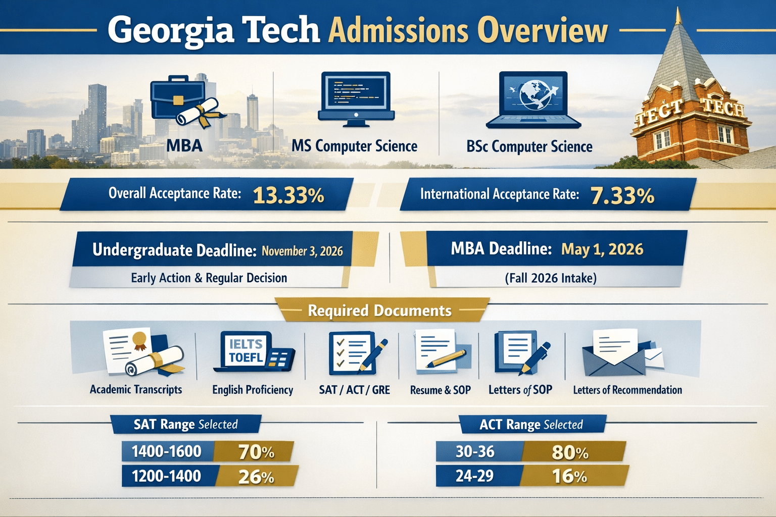 The Georgia Institute of Technology offers admission in the Fall, spring, and summer intakes. For undergraduate and MBA programs, only the fall intake is offered. International students mostly opt for the following programs: MBA, MS Computer Science, and BSc Computer Science. The acceptance rate for undergraduate programs for overall students is 13.33% and 7.33% for international students.