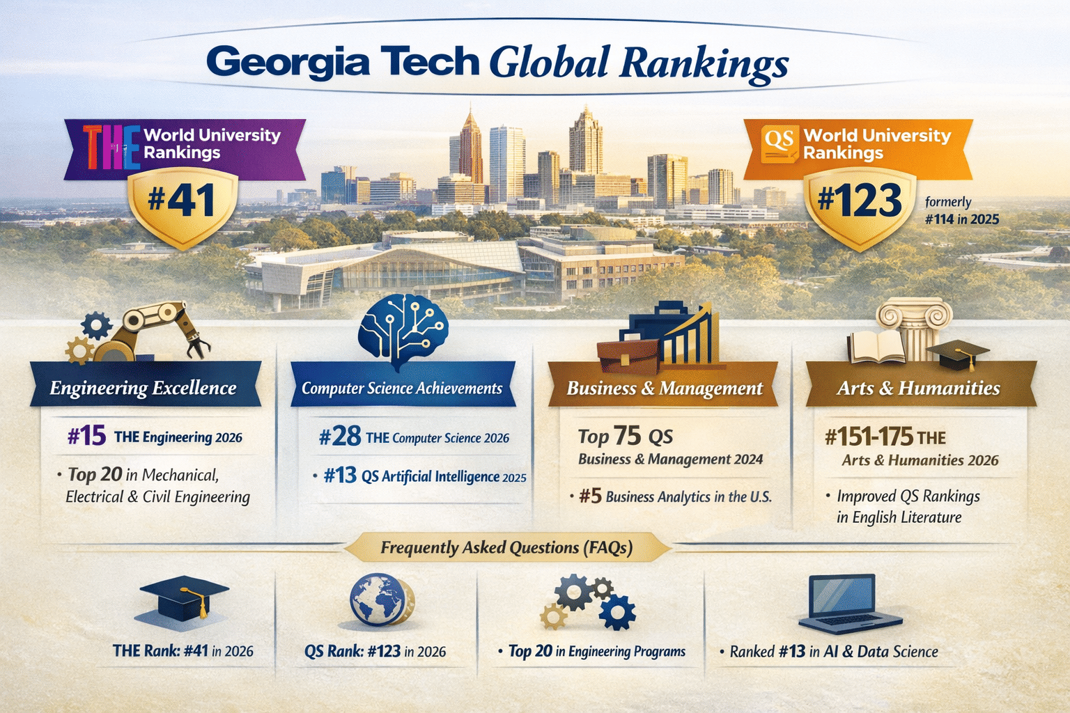 Georgia Institute of Technology in Atlanta is one of the top 50 universities in the world according to THE World University Rankings, 2026 (#41). The university secured its place at #123 in the world according to QS World University Rankings, 2026. Georgia Tech is globally renowned as one of the best Science and Technology research institutions in the world.